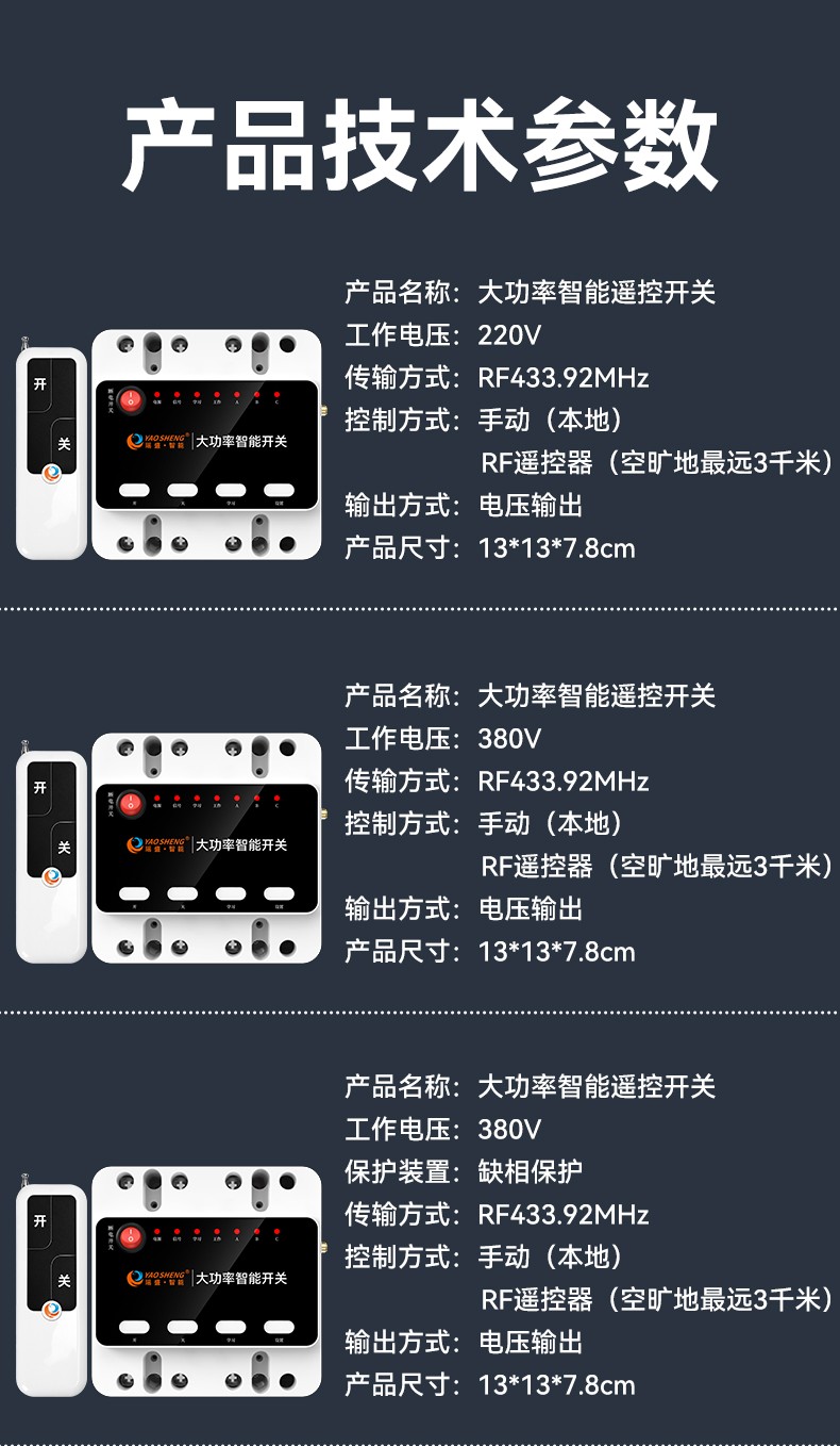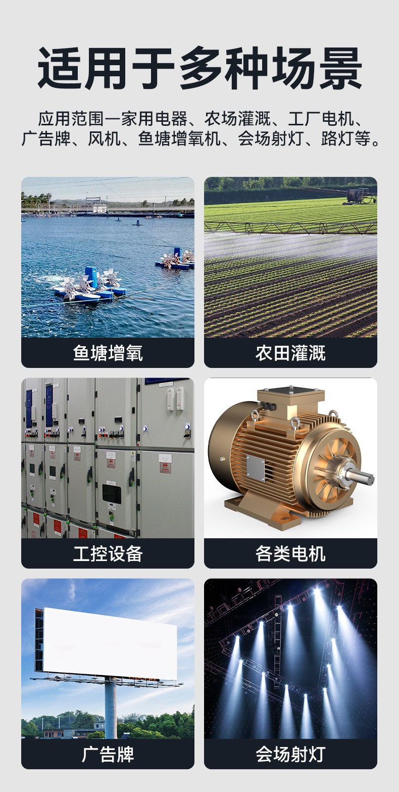 應(yīng)用場(chǎng)景:家具電器、農(nóng)田灌溉、工廠機(jī)房設(shè)備電機(jī)、水泵、機(jī)械設(shè)備、路燈控制等