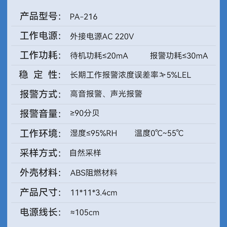 燃?xì)鈭缶?(型號PA-216D) 產(chǎn)品規(guī)格 功能特點 資料下載 燃?xì)鈭缶?(型號PA-216D)1、多種氣體檢測2、90分貝高音報警3、探測靈敏4、故障質(zhì)檢5、聯(lián)動切斷燃?xì)?/p>6、中國平安保險7.工作電源:外接電源AC220v8.適用場景:適用于家庭廚房、酒店廚房、食堂、商場等場所