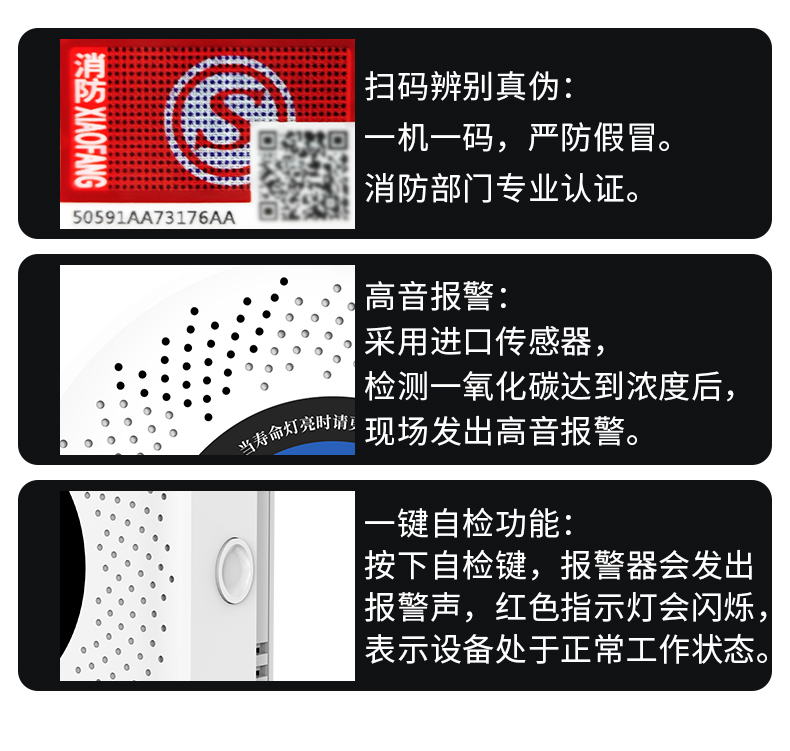 一氧化碳報警器(型號PA-008) 產(chǎn)品規(guī)格 功能特點 資料下載 一氧化碳報警器(型號PA-008)檢測氣體、燒煤、燒柴、燒炭、蜂窩媒、露營封閉環(huán)境、封閉車內(nèi)85分貝報警音量.LED液晶屏幕顯示故障自檢: 綠燈(正常)、黃燈 (故障、需要檢修) 紅燈(氣體濃度超標) 5.報警方式:蜂鳴聲提示 6. 產(chǎn)品保險:1000萬承險 7. ABS阻燃材質(zhì)適用場景:適用于廚房、浴室、起居室、火鍋包廂、飯?zhí)玫乳L時間空氣不流通的場所安裝一氧化碳報警探測器
